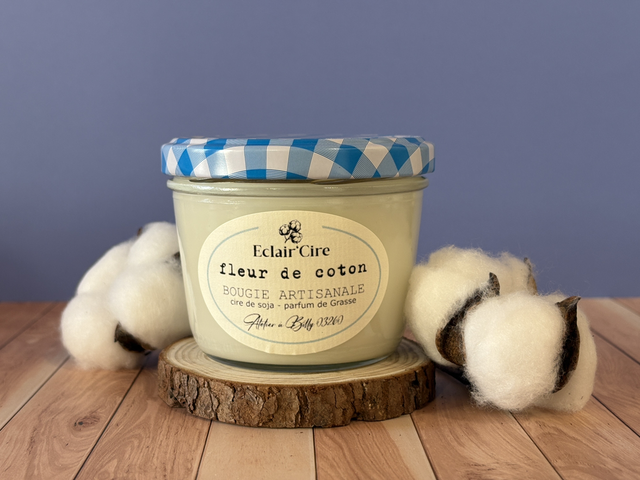 Cire végétale de soja de qualité, parfum de Grasse sans CMR et sans phtalates et une mèche 100% coton. Colorant sans CMR