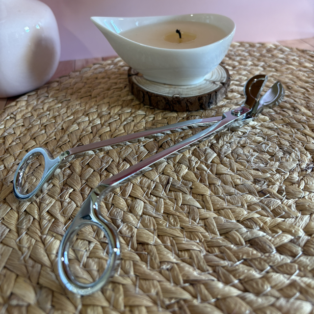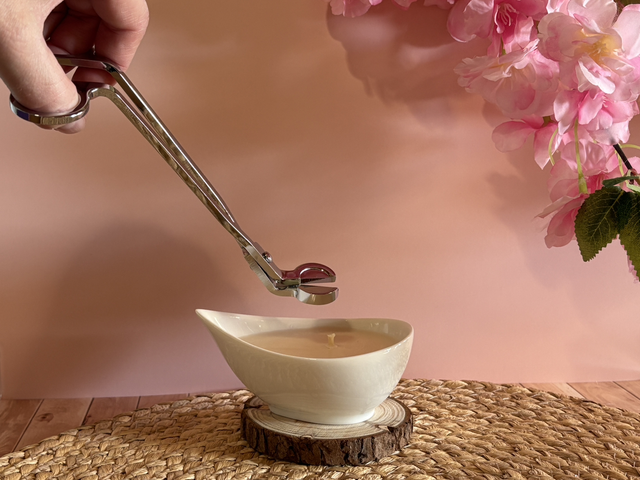 Coupez la mèche pour qu'elle ait une hauteur de 0,5 cm environ à partir de la surface de la cire. Une mèche trop longue pourrait entrainer la formation d'une flamme trop élevée, une brûle inégale, l'apparition d'une accumulation de carbone au bout de la mèche ou une fumée noire.